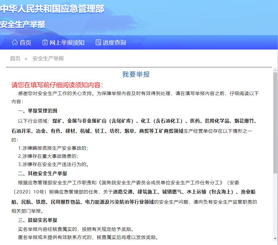 一、舉報受理范圍 以下行業(yè)領(lǐng)域:煤礦、金屬與非金屬礦山(含尾礦庫)、化工(含石油化工)、醫(yī)藥、危險化學品、煙花爆竹、石油開采、冶金、有色、建材、機械、輕工、紡織、煙草、商貿(mào)等工礦商貿(mào)領(lǐng)域生產(chǎn)經(jīng)營單位存在以下情形之一的: 1.涉嫌瞞報謊報生產(chǎn)安全事故的; 2.涉嫌存在重大事故隱患的; 3.涉嫌存在安全生產(chǎn)違法行為的。
